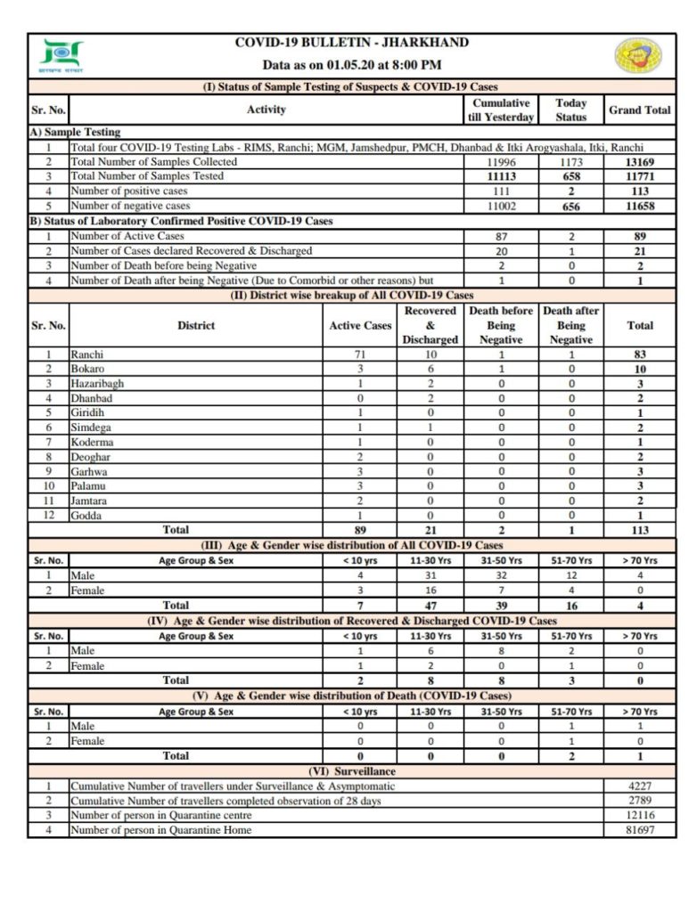 रांची- रांची में शुक्रवार को भी 2 कोरोना मरीज मिले। एक हिंदपीढ़ी और एक पुन्दाग से कोरोना मरीज मिले। झारखंड में कोरोना मरीजों की संख्या लगातार बढ़ती जा रही है। राँची में कोरोना मरीजों की संख्या 83, और राज्य में कोरोना संक्रमितों का बढं कर आंकड़ा 113 पहुंच गया है। जिसमें 89 एक्टिव केस है, 21 मरीज ठीक होकर घर लौट चुके है एवं 3 की मौत हो चुकी है।