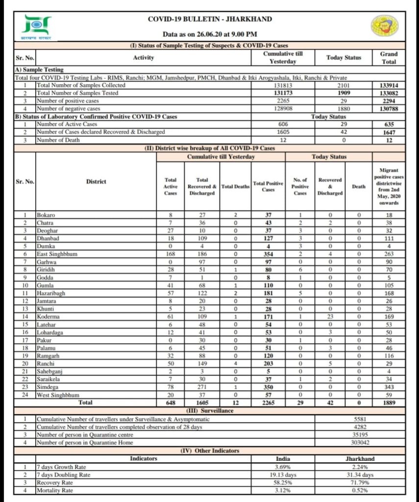 गौरतलब है कि गुरुवार को राज्य में 42 नए कोरोना संक्रमित मरीज मिले थे। जिसमें रांची से 02, बोकारो से 01, देवघर से 04, धनबाद से 01, जमशेदपुर से 06, गिरीडीह से 08, गुमला से 05, हजारीबाग से 05, खूंटी से 03, कोडरमा से 05, पलामू से 01 और सिमडेगा से 02 संक्रमित मिले थे।