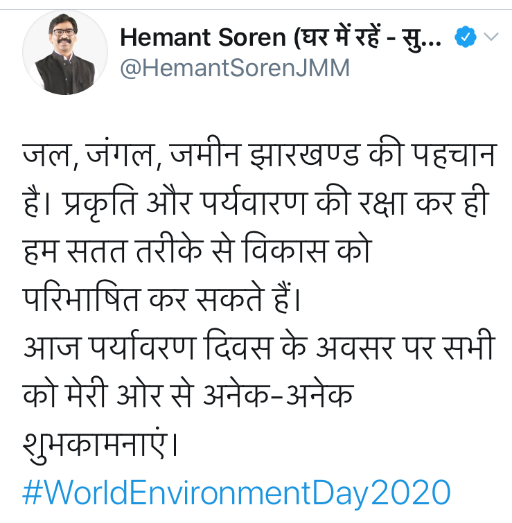 रांची- आज पर्यावरण दिवस है। सम्पूर्ण विश्व में प्रकृति की सुरक्षा व संरक्षण के लिए पर्यावरण दिवस मनाया जाता है। यह हर साल 5 जून को पूरे विश्व के साथ-साथ भारत में भी मनाया जाता है।इस साल पर्यावरण दिवस का थीम celebrate biodiversity रखा गया है। मुख्यमंत्री हेमंत सोरेन ने ट्विट कर झारखंडवासियों को पर्यावरण दिवस की शुभकामना दिया है। मुख्यमंत्री ने कहा है कि जल, जंगल और ज़मीन ही झारखंड की पहचान है। इसलिए प्रकृति और पर्यावरण की रक्षा कर ही हम सम्पूर्ण विकास को परिभाषित कर सकते है। इसलिए हम सबको संकल्प के साथ एक-एक पेड़ ज़रूर लगना चाहिये। पेड़ पौधे रहेंगे तभी पर्यावरण को बचाया जा सकता है।