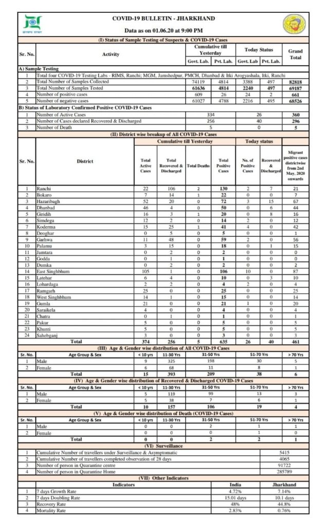 अब झारखंड सरकार ने भी lockdown में ढील देने का अलान कर दिया है। अब एक राज्य से दूसरे राज्य जाने के लिए कोई इजाज़त लेने की आवश्यकता नहीं है। अब गैर जरुरी वस्तुओं को छोड़ लगभग सभी व्यवसायिक प्रतिष्ठान नियमित खुलेंगे। इसका मतलब क़तई ये नहीं है की ख़तरा खत्म हो गया है, बल्कि और बढ़ गया है। अब हमें कोरोना के साथ जीना सिखना होगा और अपनी और अपनो की सुरक्षा के लिये सतर्क रहना होगा। हम सब की हिफ़ाज़त के लिये राज्य सरकार बार-बार अपील कर रही है की आप अनावश्यक अपने घर से बाहर ना निकले, अपने घरों में रहे सुरक्षि रहें। इसलिए सरकारी निर्देशों का पालन करें और अपनी और अपनो के सुरक्षा का ख़याल रखें और दुआ करे की ईश्वर कोरोना पीड़ित मरीज़ों और झारखंड को महफूज रखें। इसी में हम सबकी भलाई है।