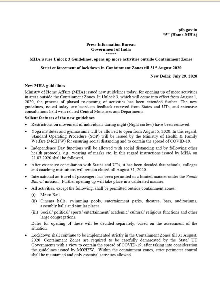 केंद्रीय गृहमंत्रालय ने का नोटिफिकेशन किया जारी, 5 अगस्त से योगा संस्थान और जिम खोलने की मंजूरी, इस दौरान मास्क लगाना अनिवार्य रहेगा, 31 अगस्त तक स्कूल और कॉलेज बंद रहेंगे, सिनेमा हॉल अभी भी बंद रहेगा