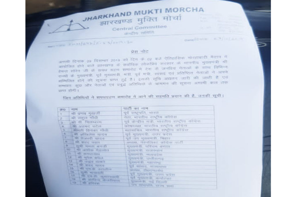 हेमंत सोरेन झारखंड के 11वें मुख्यमंत्री बनने जा रहे हैं। इनका शपथ ग्रहण समारोह भव्य और शानदार होगा। यहां देश के दिग्गजों और नामीगिरामी शख्सियतों की जुटान होगा। राजधानी रांची के स्थानिय मोरहाबादी मैदान में 29 दिसंबर, को दोपहर 2 बजे शपथ ग्रहण समारोह होना है। इसमें शामिल होने के लिए कई नामचीन हस्तियों और देश के धाकड़ राजनेताओं ने अपनी सहमति दे दी है। इस महत्वपूर्ण आयोजन को यादगार बनाने के लिए भाजपा विरोधी नेताओं की पूरी जमात जुटेगी।