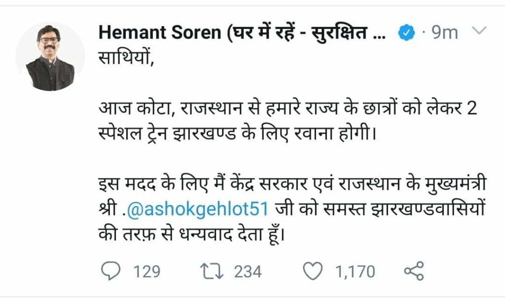रांची- मुख्यमंत्री हेमंत सोरेन ने ट्वीट कर जानकारी दी है कि कोटा, राजस्थान में फंसे राज्य के छात्रों को लेकर 2 स्पेशल ट्रेन आज झारखण्ड के लिए रवाना होगी।